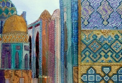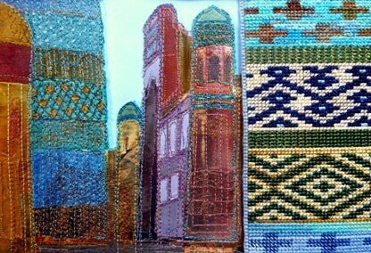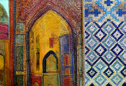 Being given a copy of Peter Frankopan's 'The Silk Roads' sparked my interest in the subject and in particular the wonderful geometric art associated with the architecture of these historic cities. Later when when our group held their exhibition entitled ' Voyages ' at Fisherton Mill, Salisbury I used this as my theme. Basing collages on some of the visual imagery available on line my specific focus was to interpret several of the complex tiling patterns in needlepoint